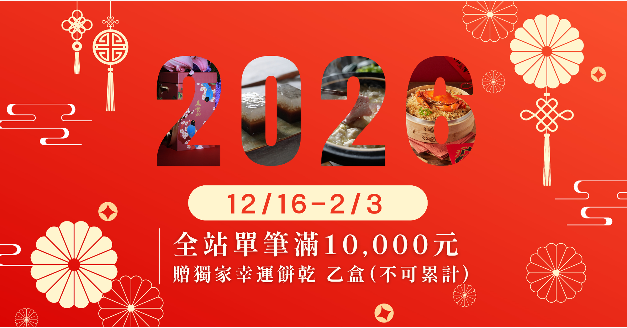 12/16-2/3全站單筆訂單金額滿10,000元即贈,美食加獨家幸運餅乾/盒,不可累計。美食加祝你馬力全開,薪想事成!
