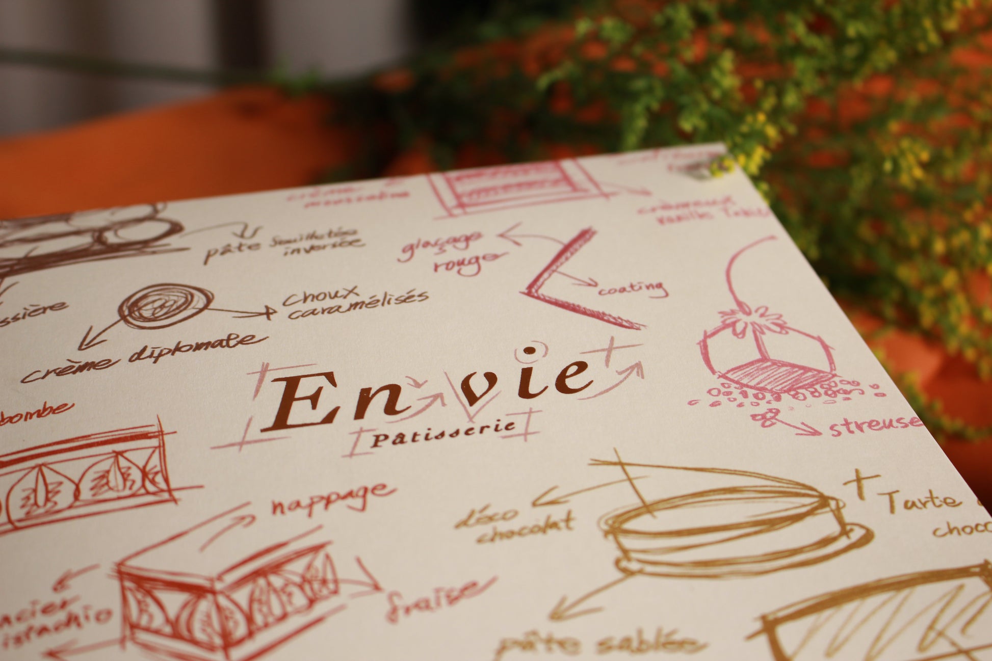 envie 是渴望或者是想要的意思,剛好可以拆開法文中 en和 vie 代表 正在 與 生命。生而在世的甜點店就這麼出生了。只是不想中文名太嚴肅,取為在室甜點。