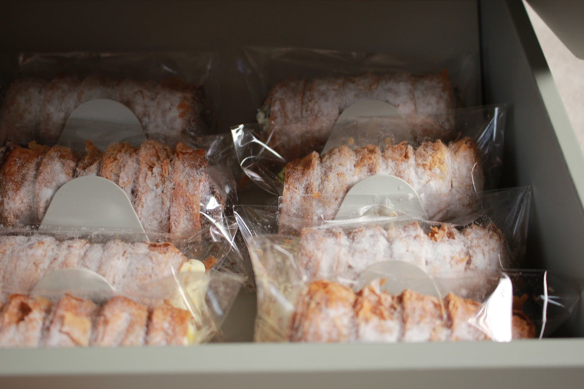 千層捲捲酥,還有一個類似「孔雀捲心餅」的性質:冰冰吃更好吃!由於冷凍出貨,你可以不必等待回到室溫,有一點退冰時就吃,就像吃冰淇淋捲一樣爽快!