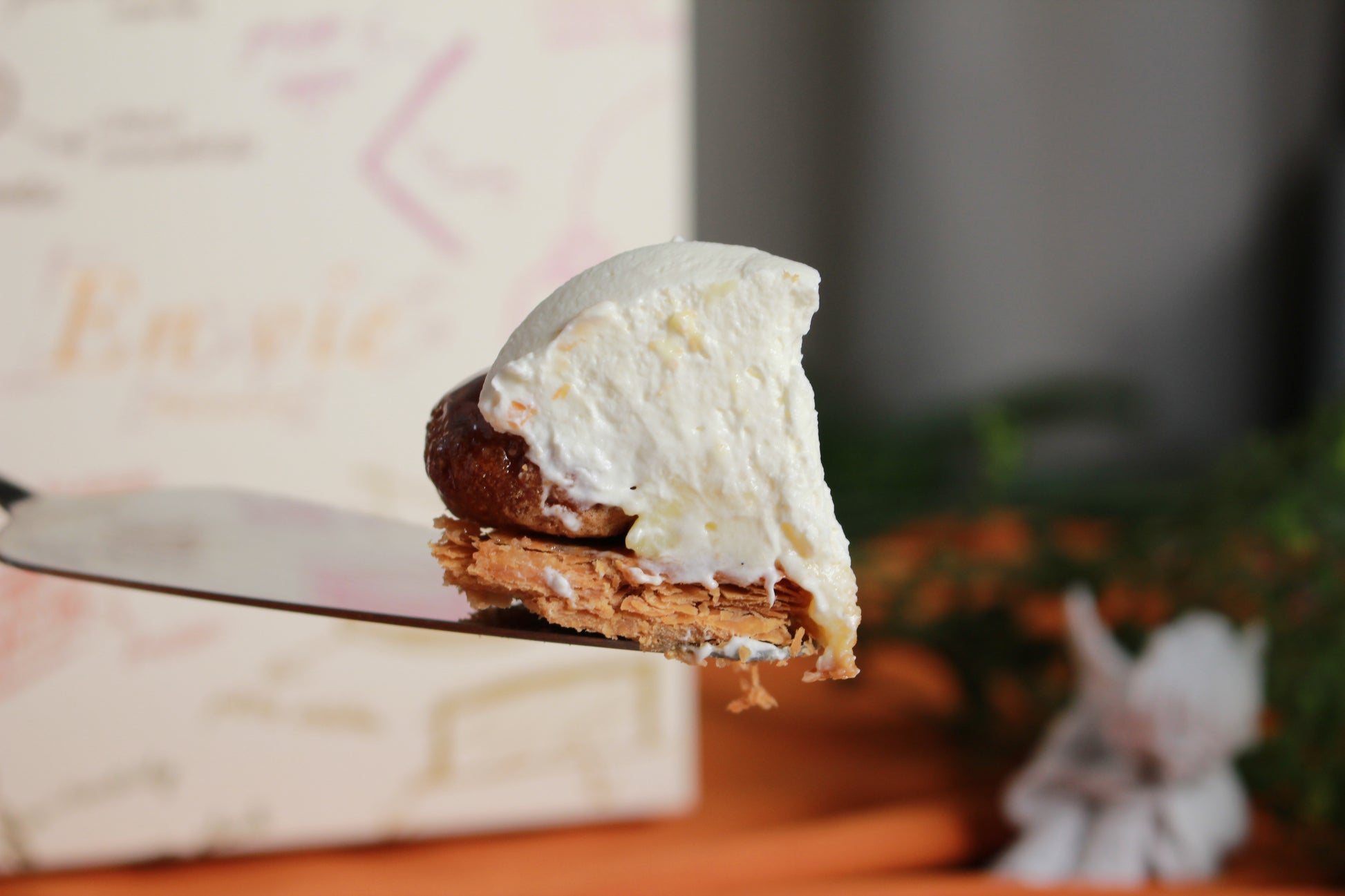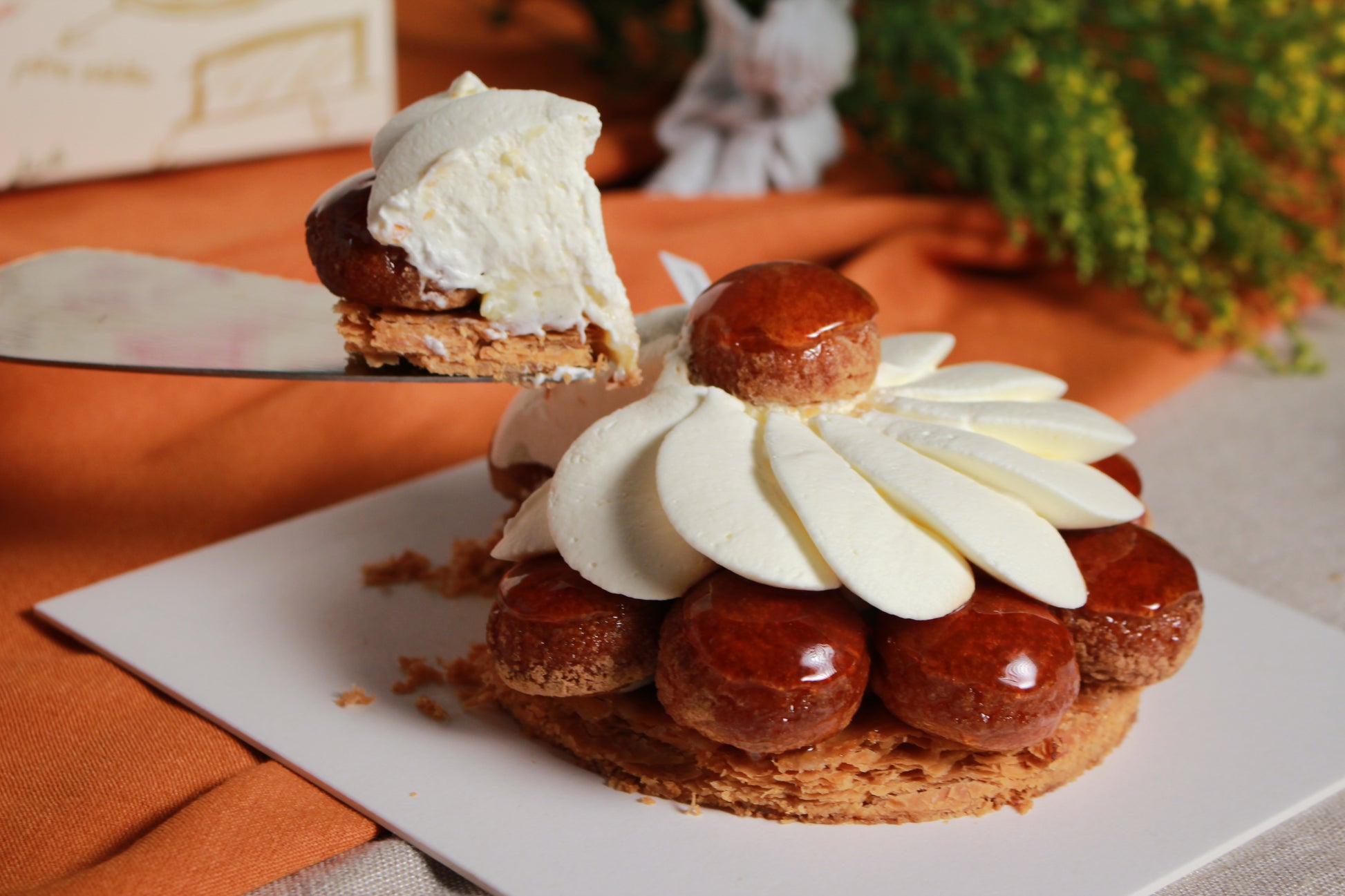 由千層塔皮、卡士達醬、柔嫩的奶油,焦香脆口的泡芙組合而成,這道甜點,就該是一刀切落完整感受,一口放入嘴裡咀嚼玩味,戈就該是如此直球對決味蕾的感受,請將它一起放入口中,讓味覺享受這場盛宴。
