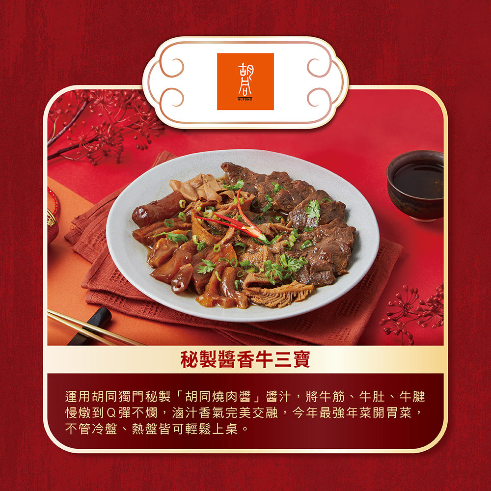運用胡同獨門秘製「胡同燒肉醬」醬汁,將牛筋、牛肚、牛腱慢燉到Q彈不爛,滷汁香氣完美交融,今年最強年菜開胃菜,不管冷盤、熱盤皆可輕鬆上桌。