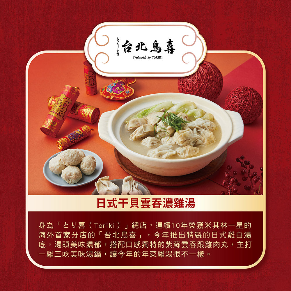身為「とり喜(Toriki)」總店,連續10年榮獲米其林一星的海外首家分店的「台北鳥喜」,今年推出特製的日式雞白湯底,湯頭美味濃郁,搭配口感獨特的紫蘇雲吞跟雞肉丸,主打一雞三吃美味湯鍋,讓今年的年菜雞湯很不一樣。