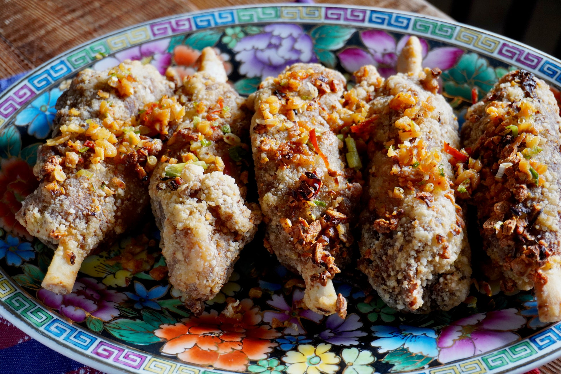 選用在地的台灣豬,取豬骨部位,肉質軟嫩,經由炸過但肉質不柴,加入蔥末、辣椒末、蔥米、胡椒塩的調味,讓肉香更加提升,是大人小孩都愛的一道料理。