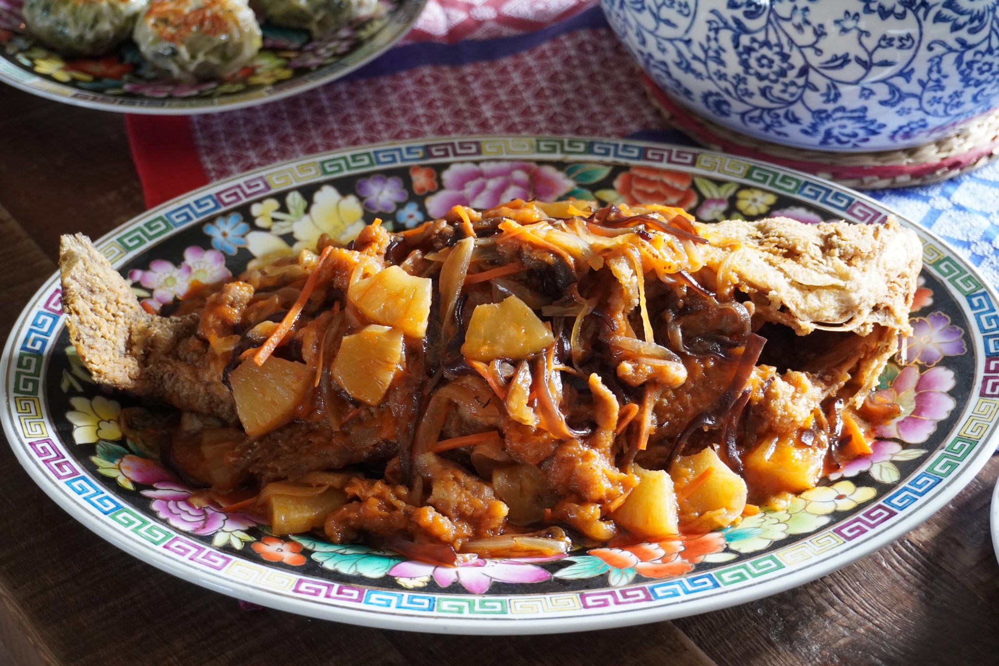 ➌蒸籠 (蒸鍋):水滾蒸約15分鐘中心點熱透即可,將加熱好的五柳糖醋醬汁淋上去。