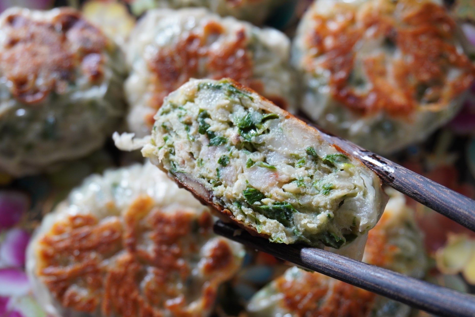 薄麵皮以黃金比例包入內餡,以鮮甜的蝦仁搭配香味濃厚的韭菜,再加入肥瘦均勻的豬絞肉,內餡吸附飽滿湯汁,豐富餡料在口中呈現滿足感,可煎到兩面外皮帶點焦黃的顏色,外層酥脆內餡有著草蝦仁的鮮脆及韭菜的香味,讓人一口接一口,金黃香酥口口讚!