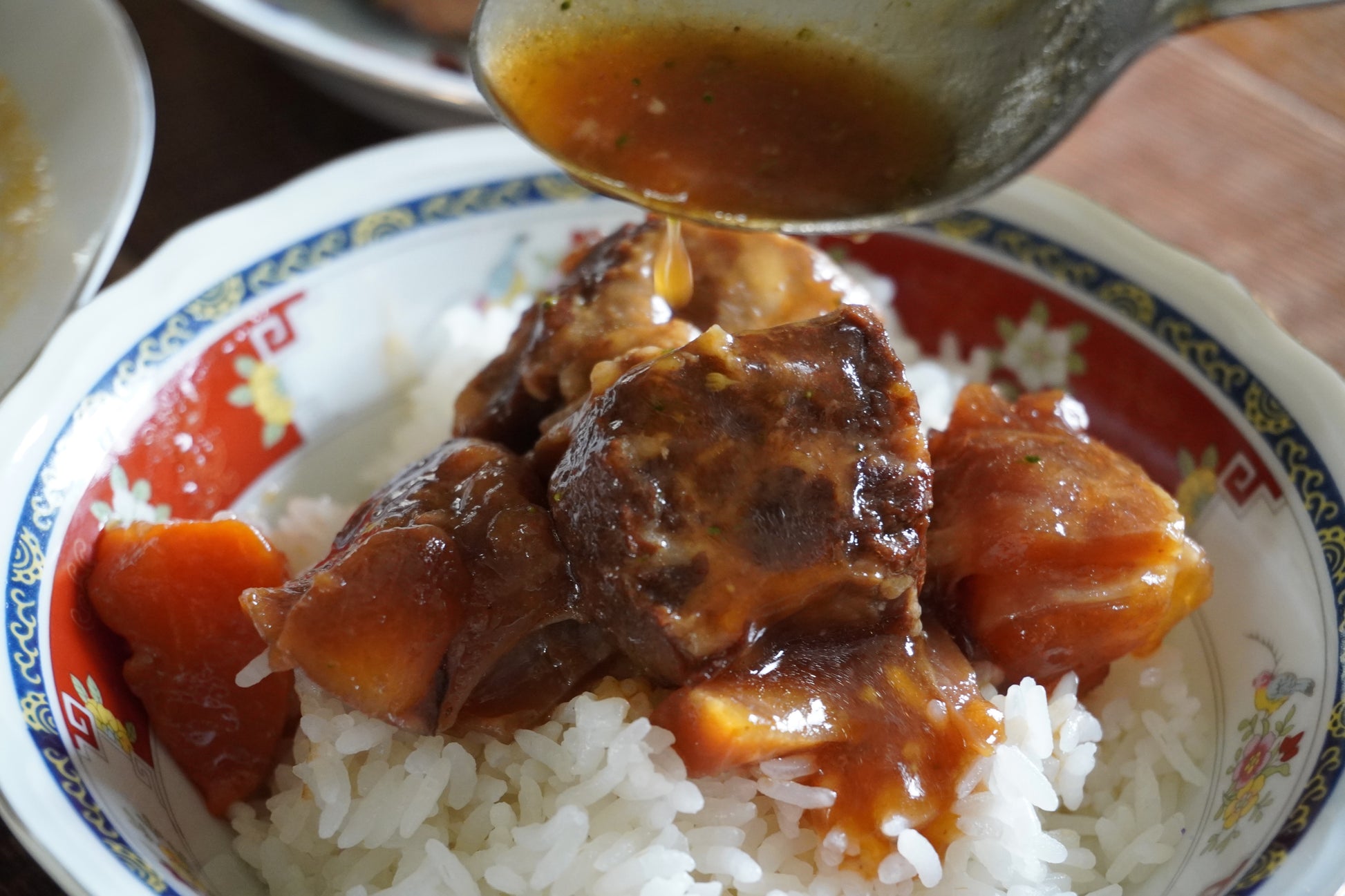 那裡的客飯之於我,是一碗蝦腰麵、菜肉餛鈍,更經常是一份排骨菜飯。我曾經說過,蔡萬興的排骨菜飯極似我父親在我們小時候做的味道,醬油醃過的帶骨豬排炸得乾爽,配以青江菜燜得萎黃的飯,這老土的滋味,是我的鄉愁。