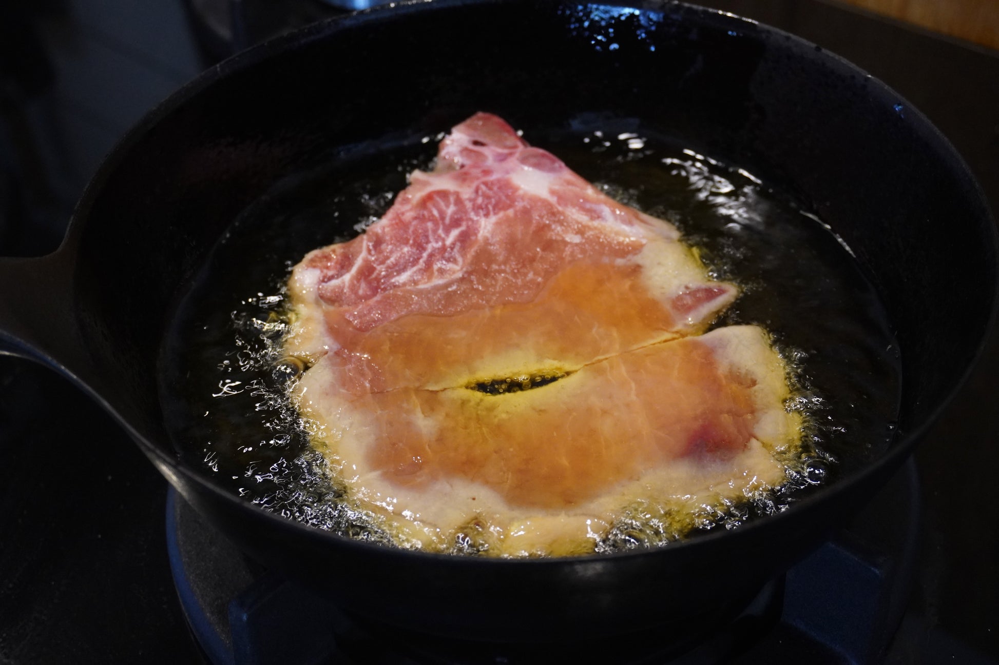 温體豬排醃漬後,入冷箱入味又緊緻肉質,不沾粉油炸看的到肉的原型,吃的到肉的焦香。