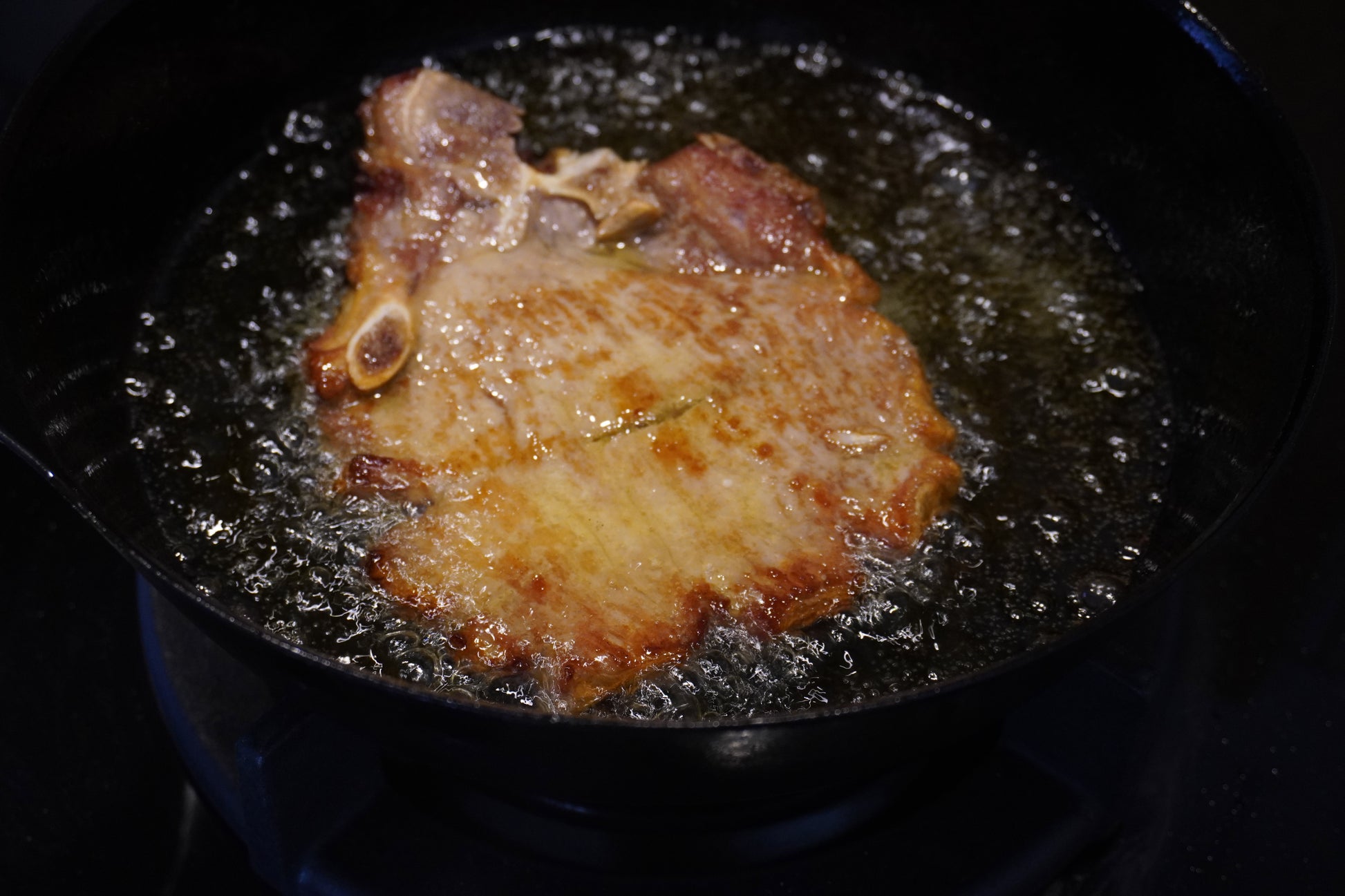 - 退冰完成後,220度的温度,有骨頭的邊,先炸約30秒,再整片放入炸至兩面金黃。
