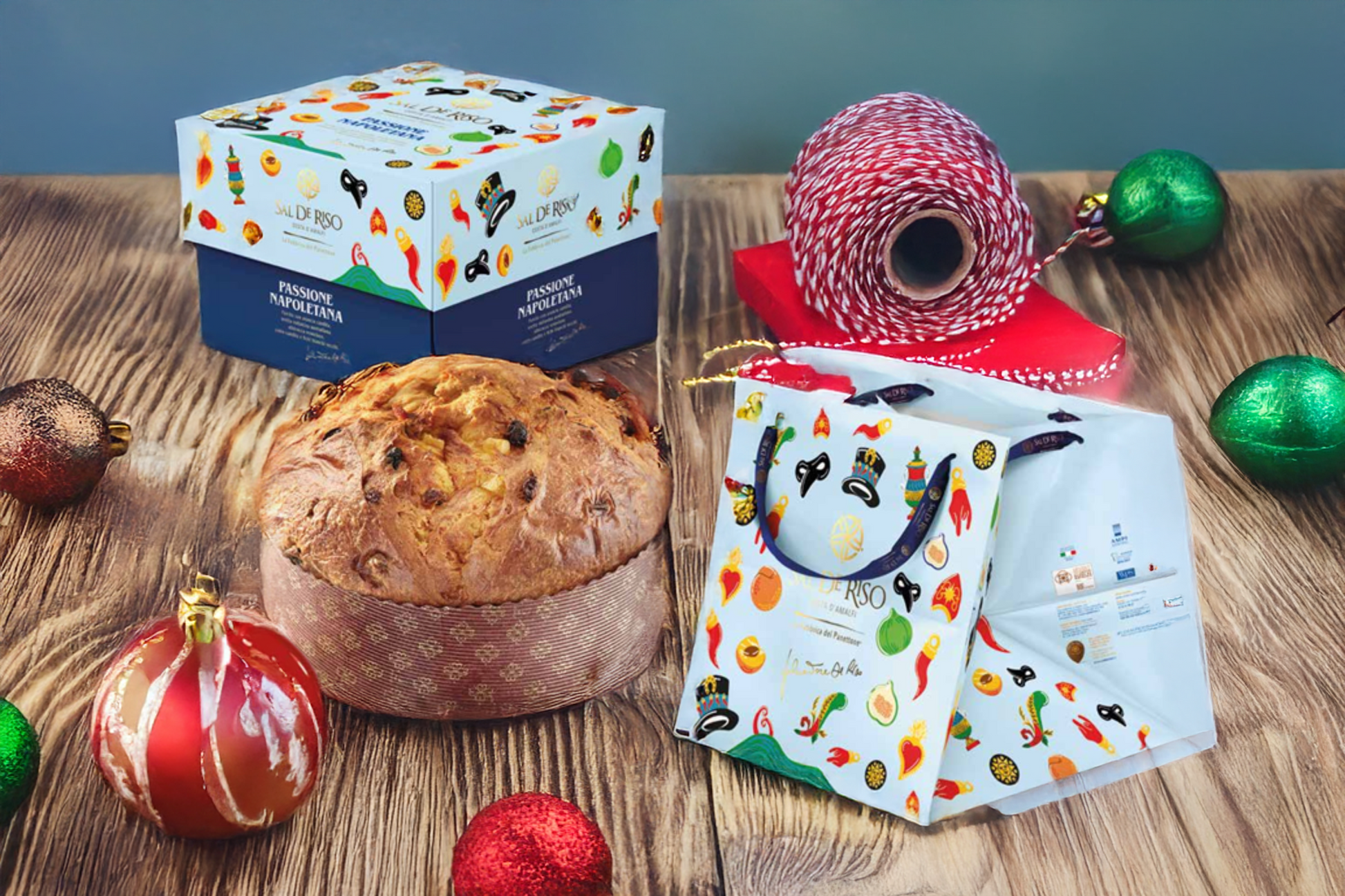 靈感來自那不勒斯的熱情文化,以蜜漬橙皮、澳洲葡萄乾、維蘇威杏桃、蜜漬雪松果乾與乾白無花果交織出豐富口感。搭配繽紛設計禮盒與象徵幸運的陶瓷小紅角飾物,寓意喜慶與祝福。