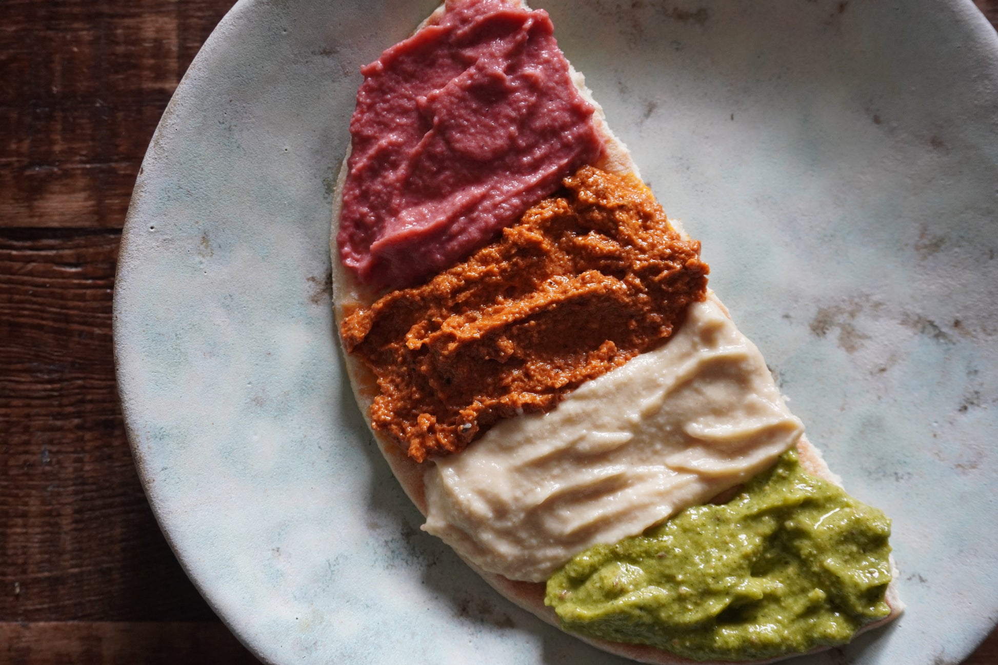 ▸開心果酪梨叢林醬+穆哈瑪拉+經典鷹嘴豆泥+粉紅甜菜鷹嘴豆泥