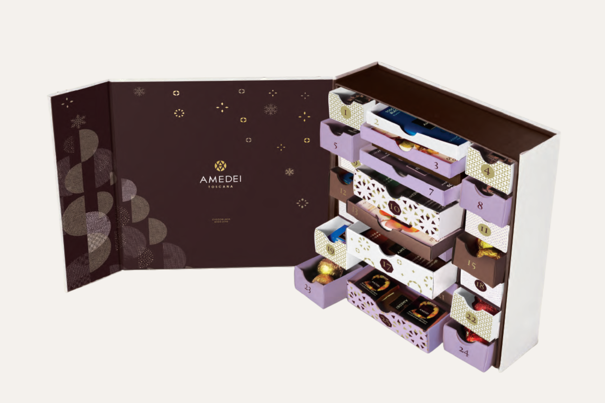 歷年暢銷款AMEDEI 耶誕倒數日曆!每日趣味多變!驚喜不斷!25款 AMEDEI 精選巧克力:包含醇黑巧克力、牛奶巧克力、白巧克力、堅果巧克力、水果巧克力、咖啡巧克力、手工夾餡巧克力等等。