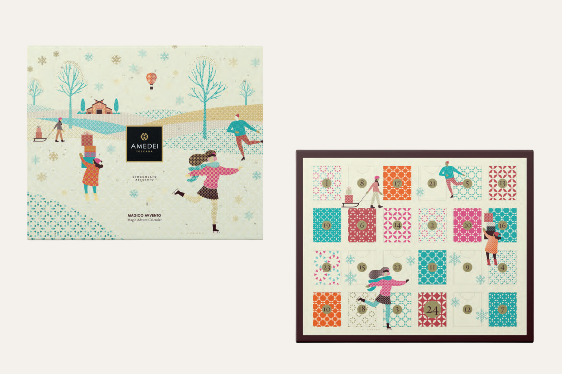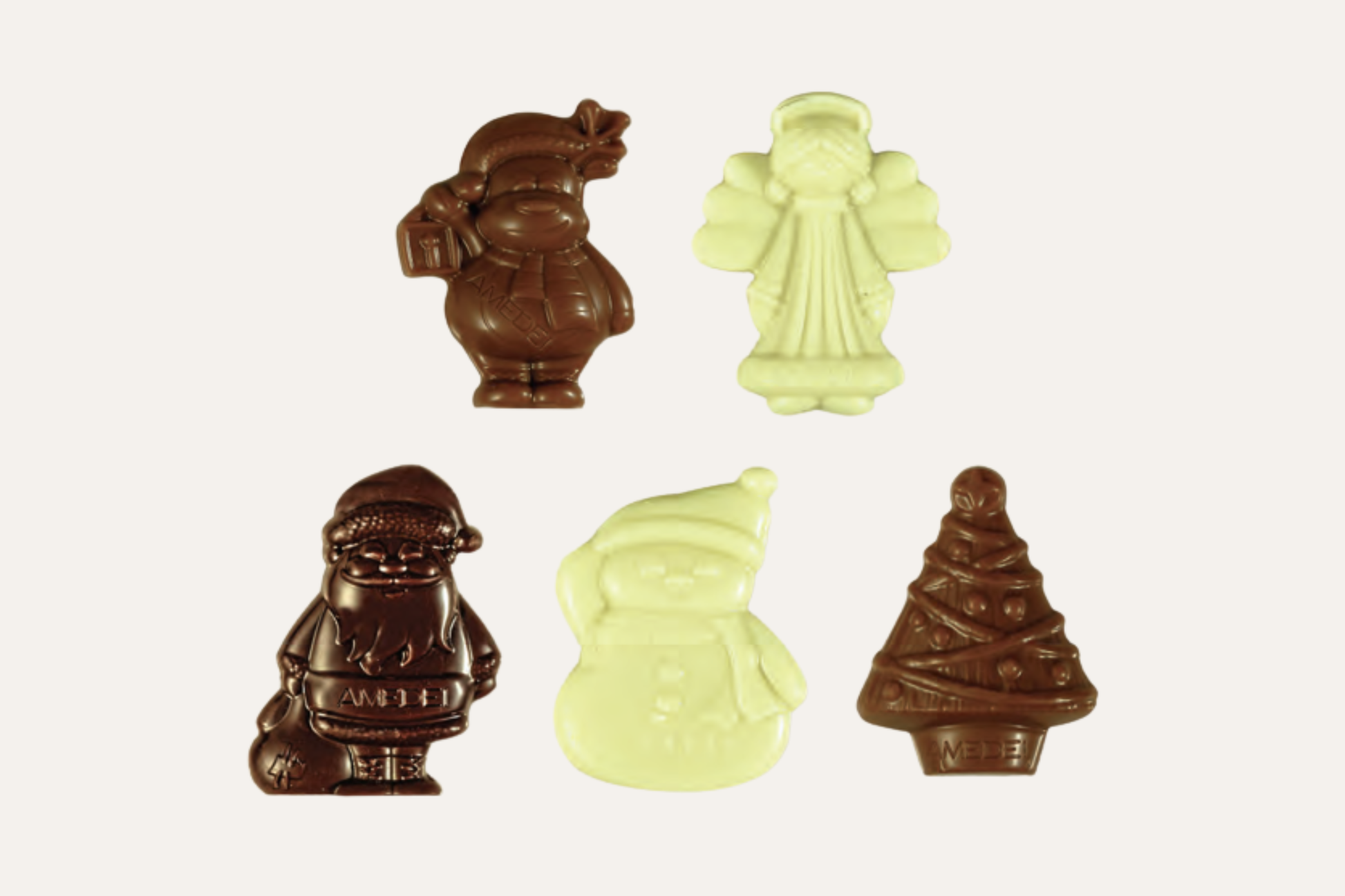 禮盒內24 個小盒子,捕捉聖誕節的精髓,每個盒子裡都裝著用牛奶、黑巧克力或白巧克力製成的可愛聖誕人物。