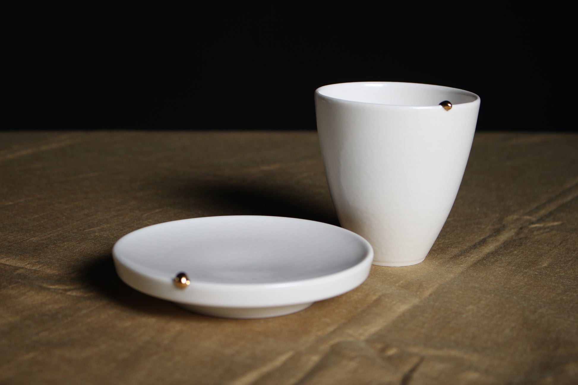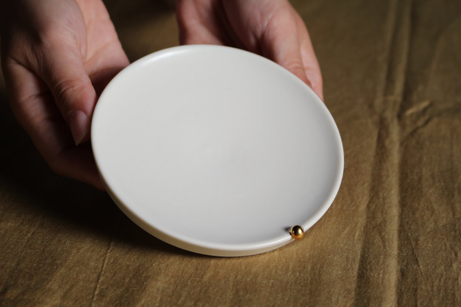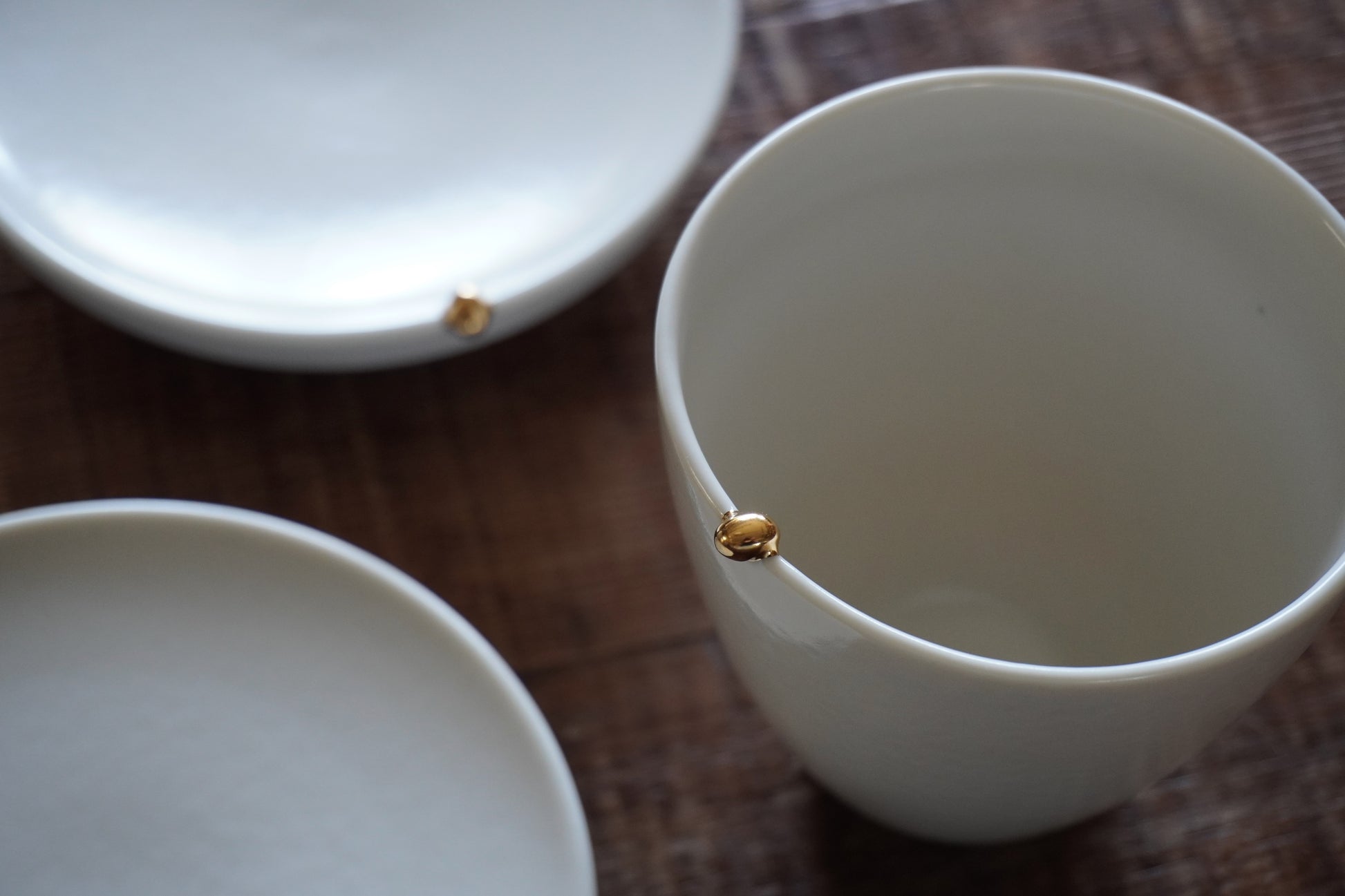 溫潤杏白的胎體,披著滑而不亮的釉,厚實的杯壁與盤身,滲出暖意在掌心。如果僅僅這樣,這組作品不過就是質樸;偏偏,在柔緩曲線的盡頭,永勝老師擠了顆「豆豆」,塗上金光,惹人注目。垂在邊上的小金豆,太可愛了吧!