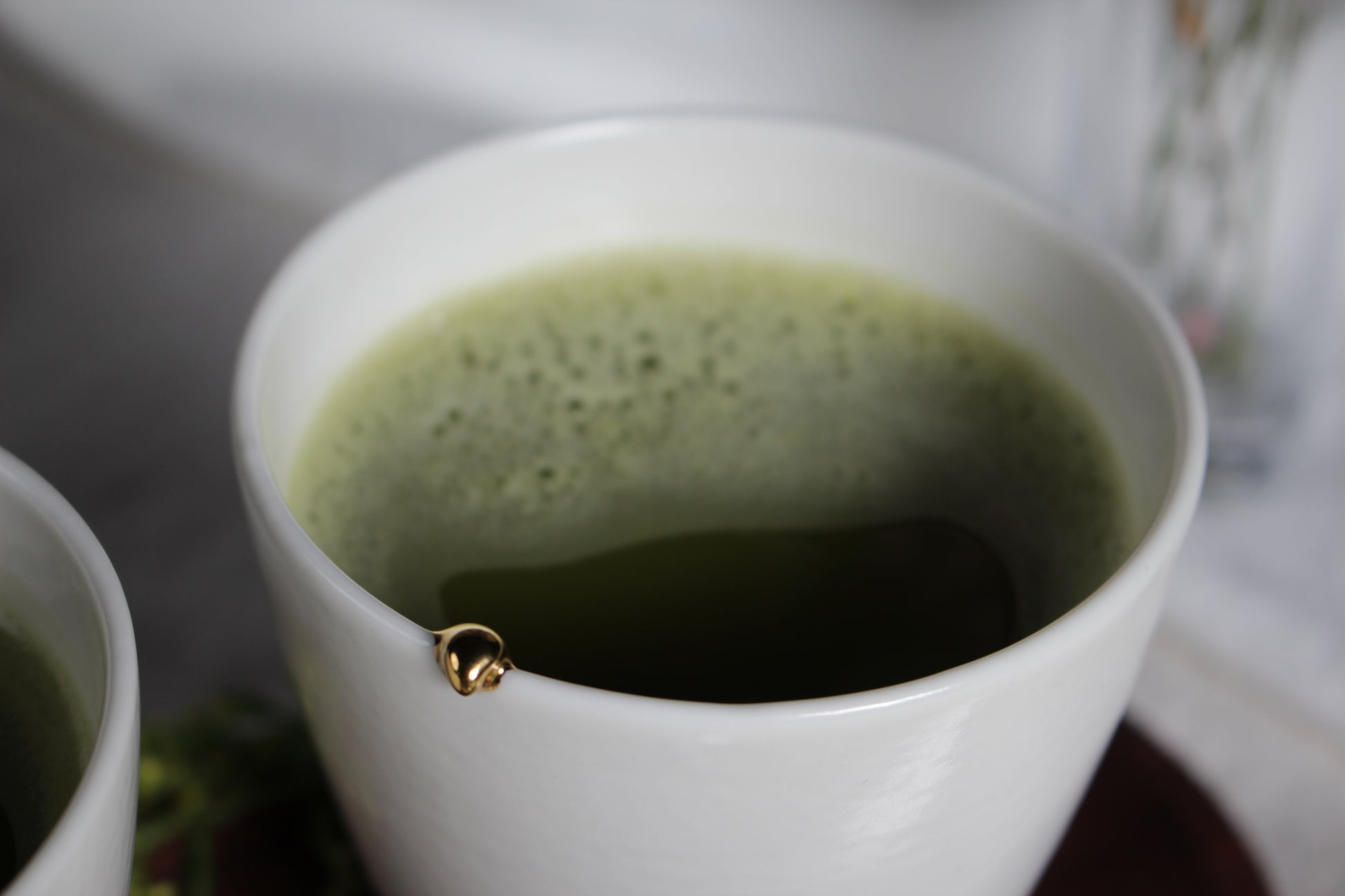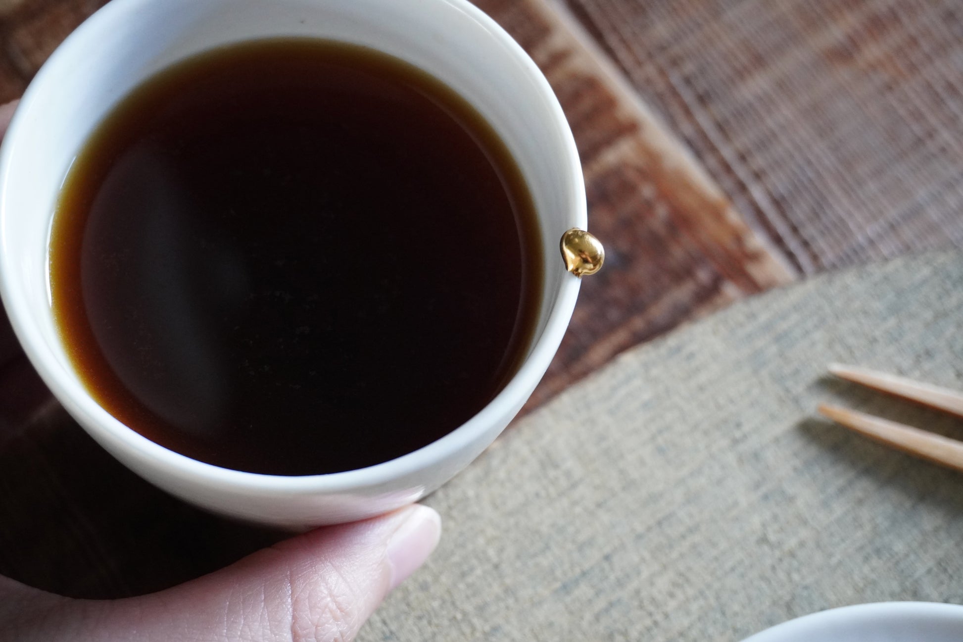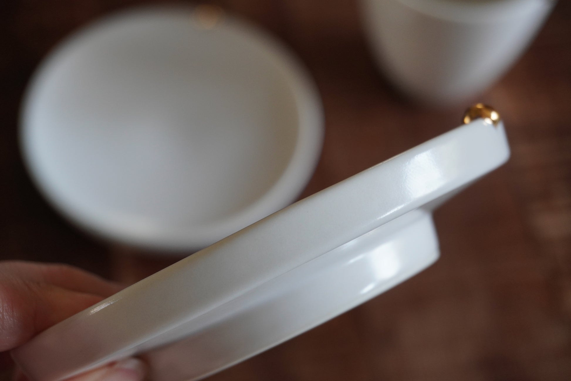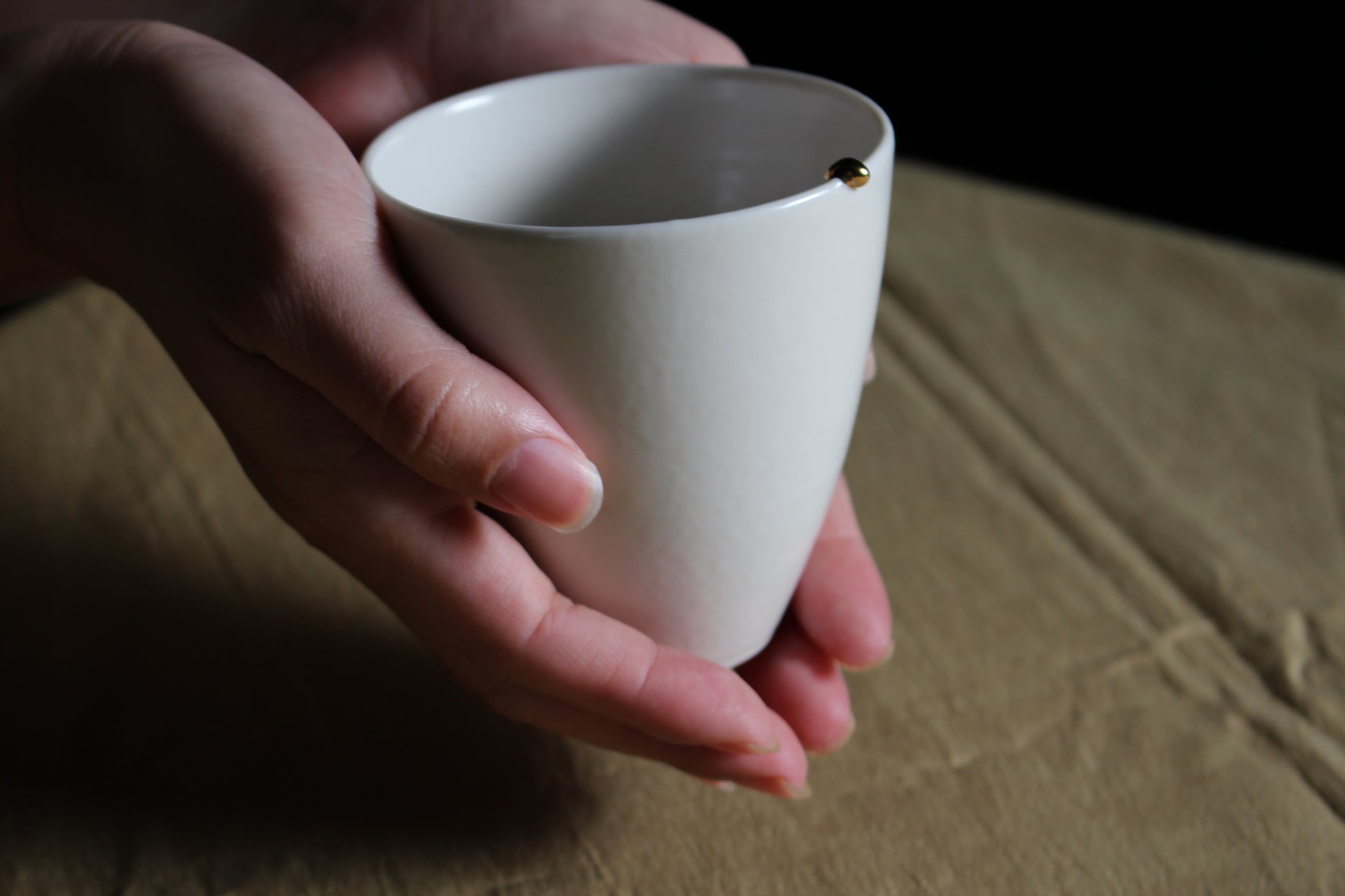 溫潤杏白的胎體,披著滑而不亮的釉,厚實的杯壁與盤身,滲出暖意在掌心。如果僅僅這樣,這組作品不過就是質樸;偏偏,在柔緩曲線的盡頭,永勝老師擠了顆「豆豆」,塗上金光,惹人注目。垂在邊上的小金豆,太可愛了吧!
