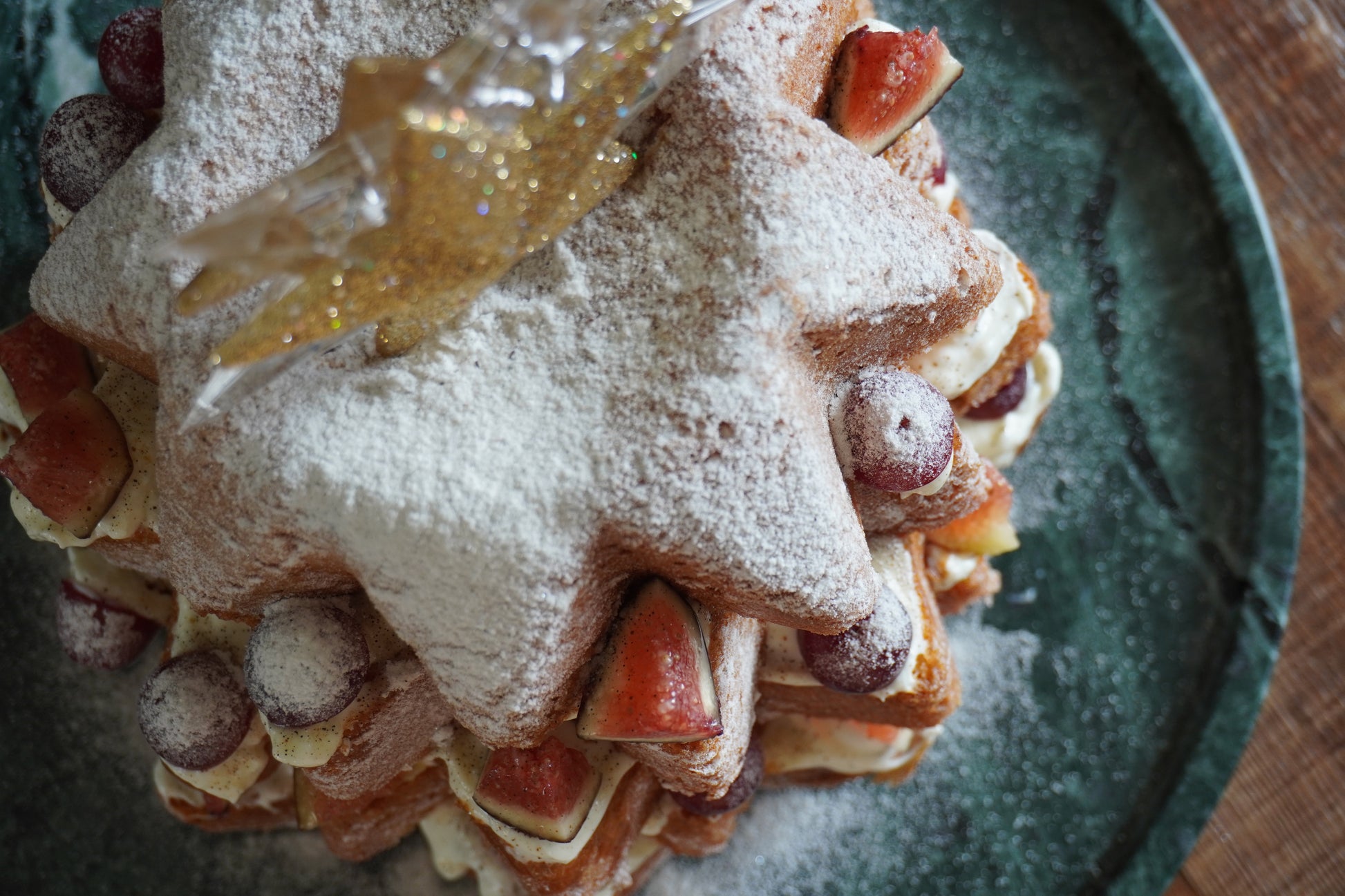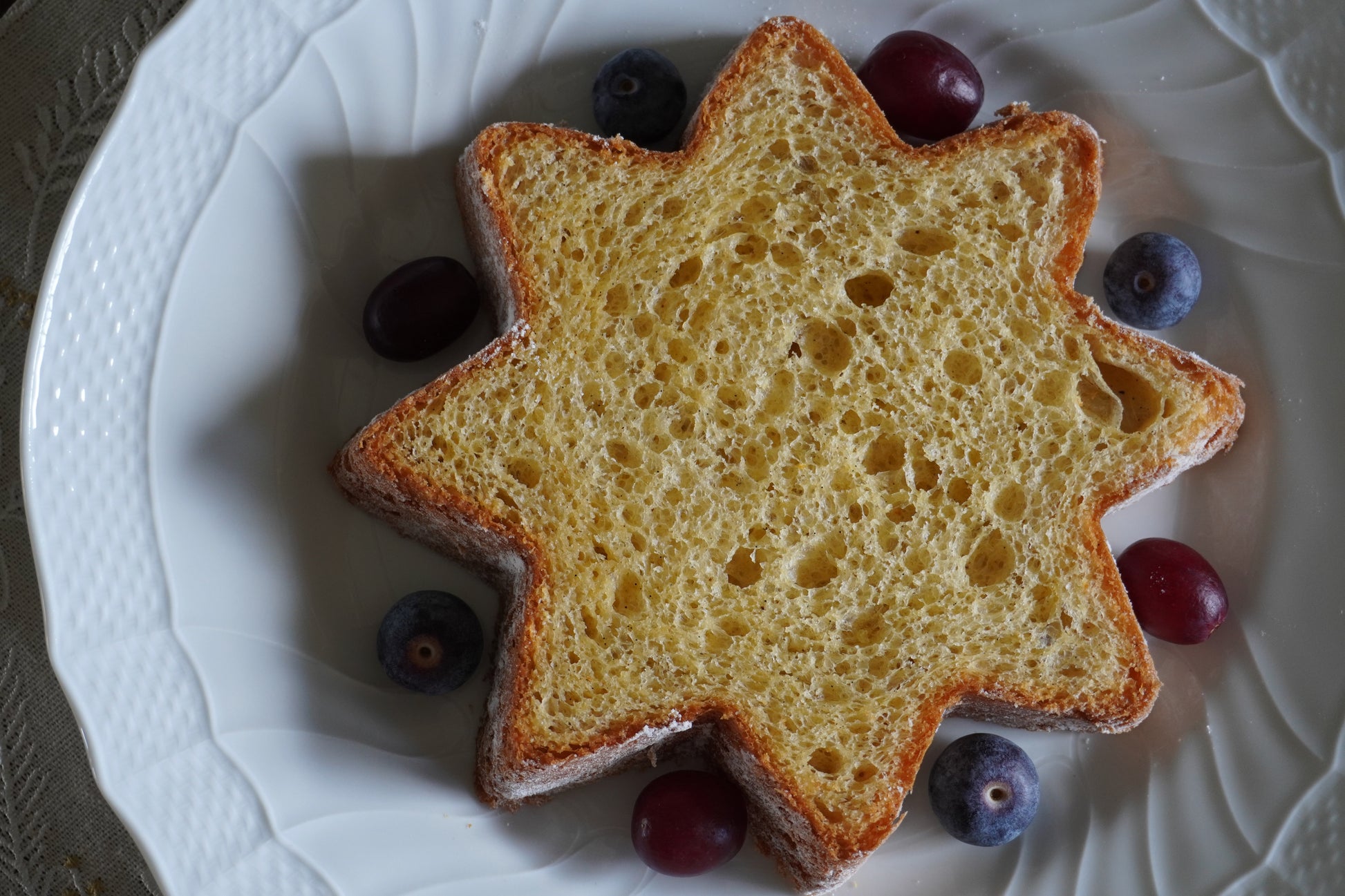 撒過糖粉的黃金麵包,可以直切成長塊,更可以橫切成星型。我非常推薦橫切,八芒星型賞心悅目,再裝飾上自己喜歡的水果、果醬、榛果醬,就是好好吃的甜點!