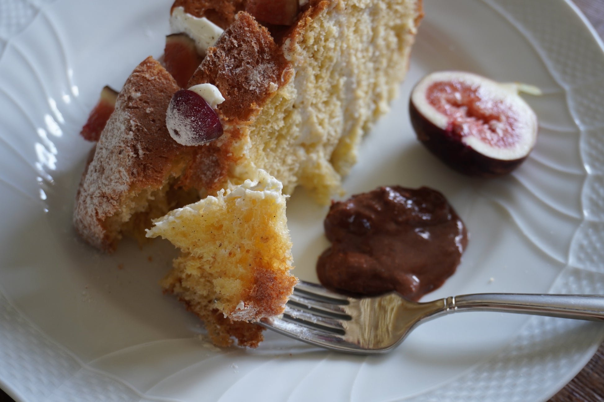 再厚工一點,可以在每一層切片剖面上,塗抹打發鮮奶油或馬斯卡彭起司,製造「積雪」的感覺,也增加油脂的滑順感。我用的是希臘優格,更清爽,可以放在濾網上濾掉水分約30分鐘,質地更紮實。