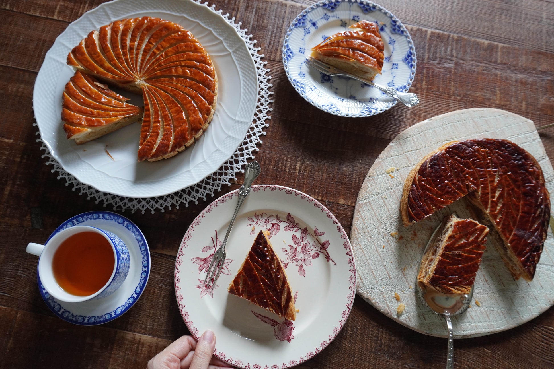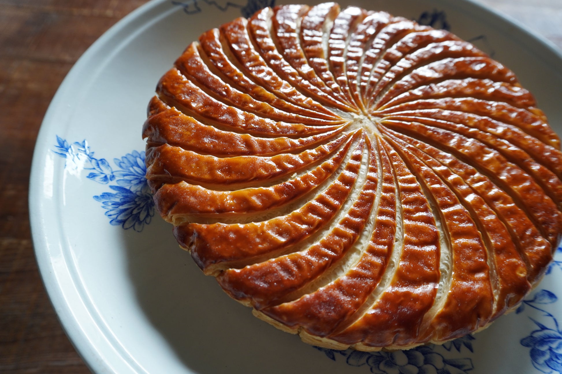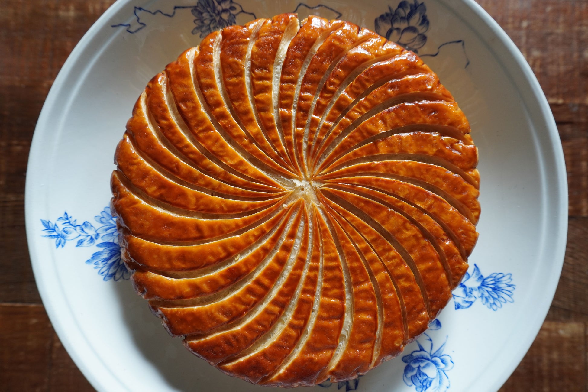 1月6日主顯節,法國習俗吃國王餅。這款傳統的酥餅,發揮高超的法國奶油酥皮折疊技巧,細細描繪上花紋,烤至發亮。