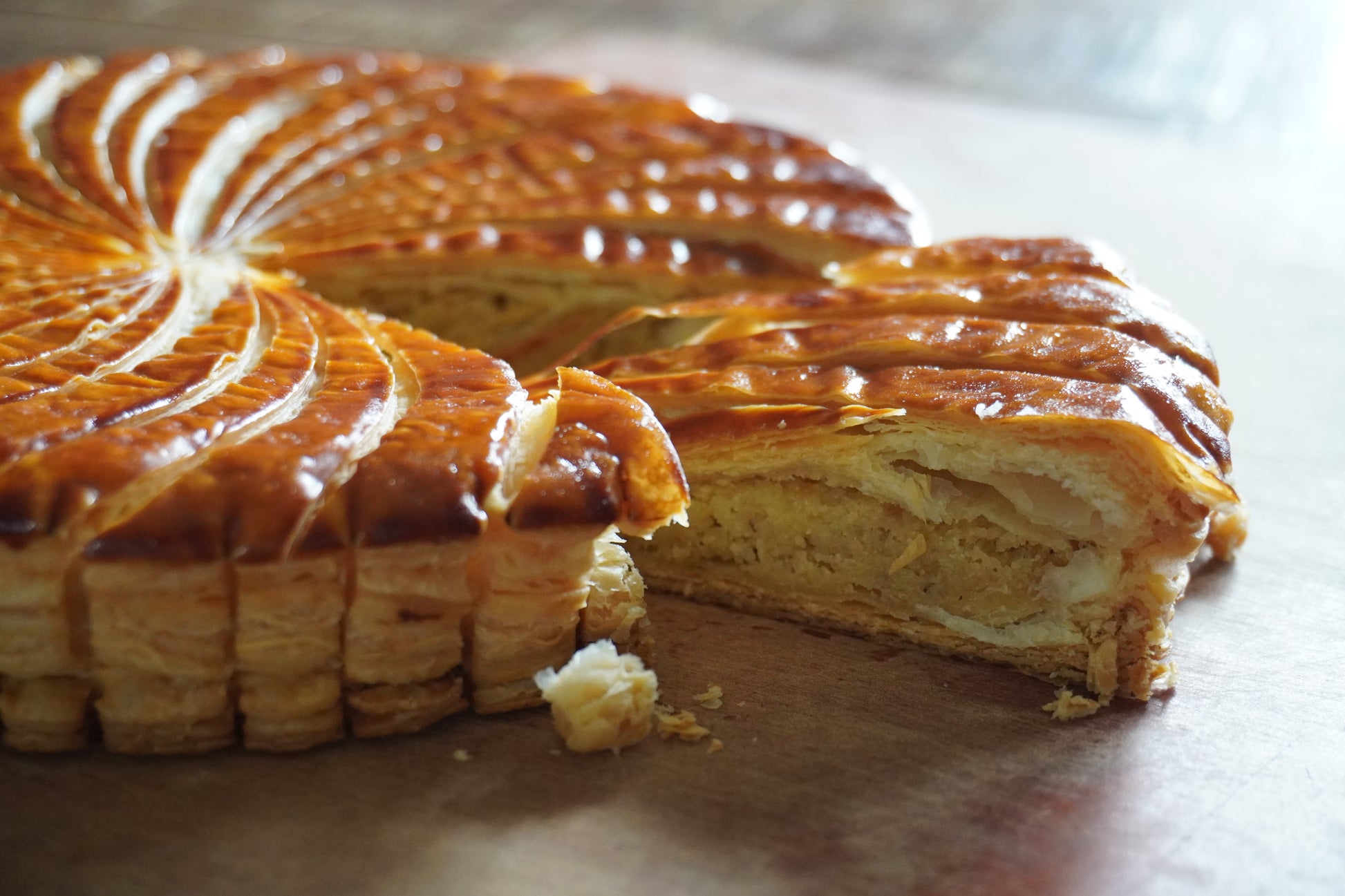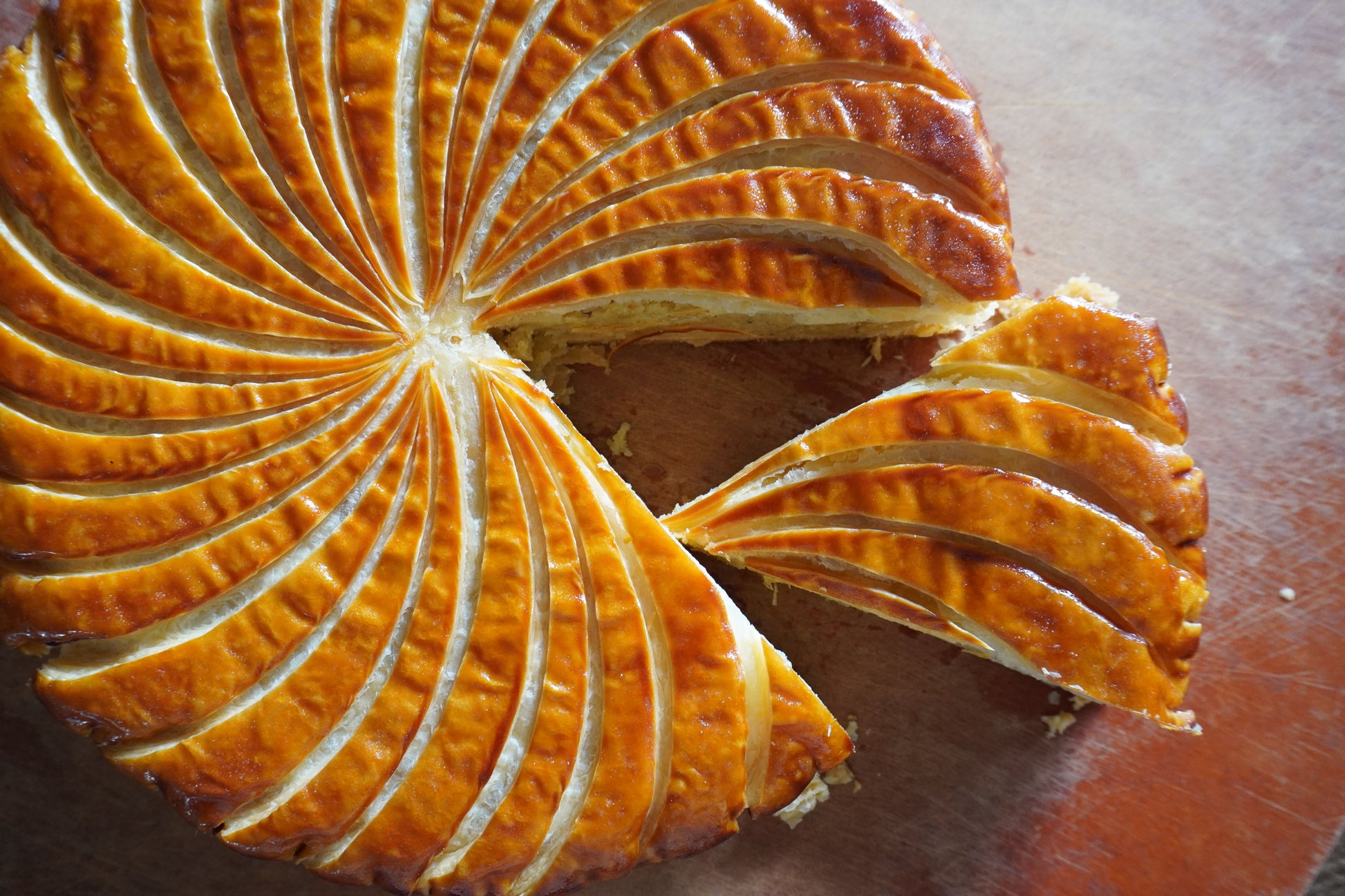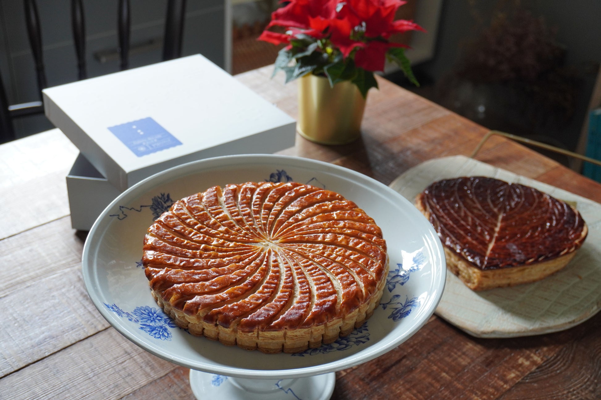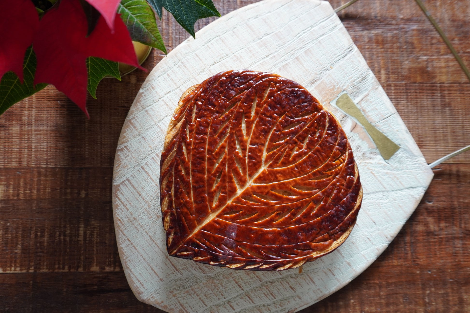1月6日主顯節,法國習俗吃國王餅。這款傳統的酥餅,發揮高超的法國奶油酥皮折疊技巧,細細描繪上花紋,烤至發亮。