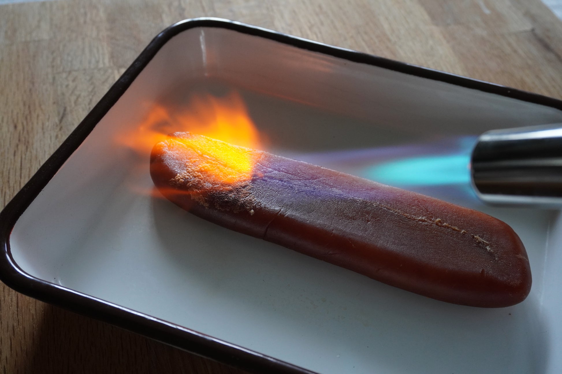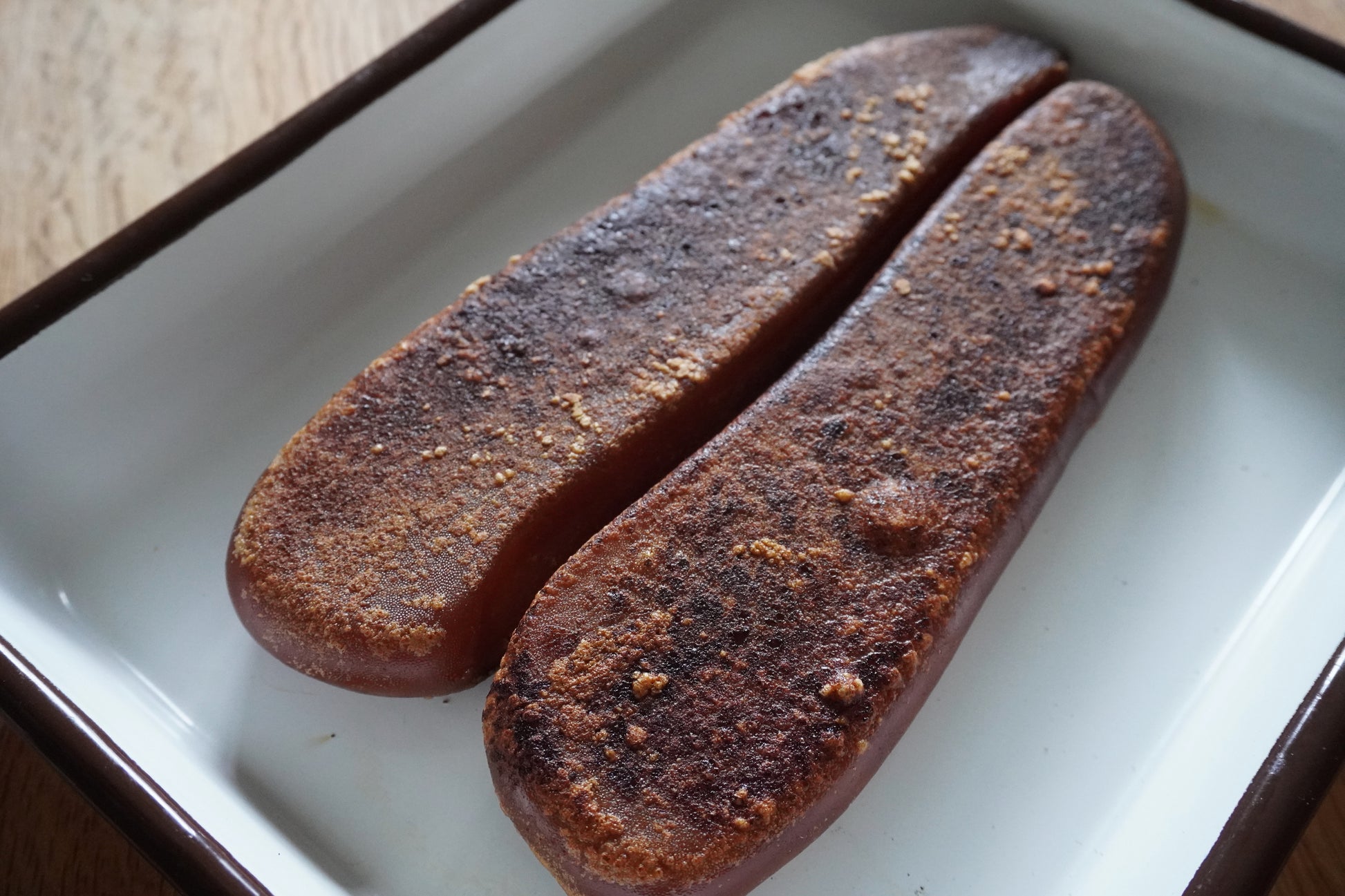 其實,台灣養殖技術進步,不少人呼籲,養殖烏魚子的風味不輸野生。不過,野生之所以維持高檔地位,除了傳統上烏魚季節性洄游的「烏金」形象,以及長年建立的送禮文化,也有許多人偏愛野生烏魚子磚紅大氣的色澤,以及濃郁洶湧的海味。野生烏魚子風味醇厚複雜,那是烏魚在洄游過程中吃下不同餌料所累積的底蘊