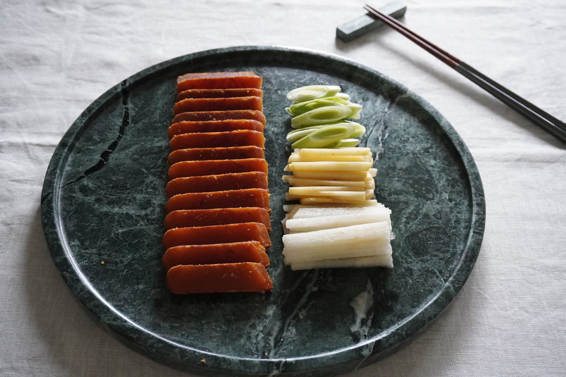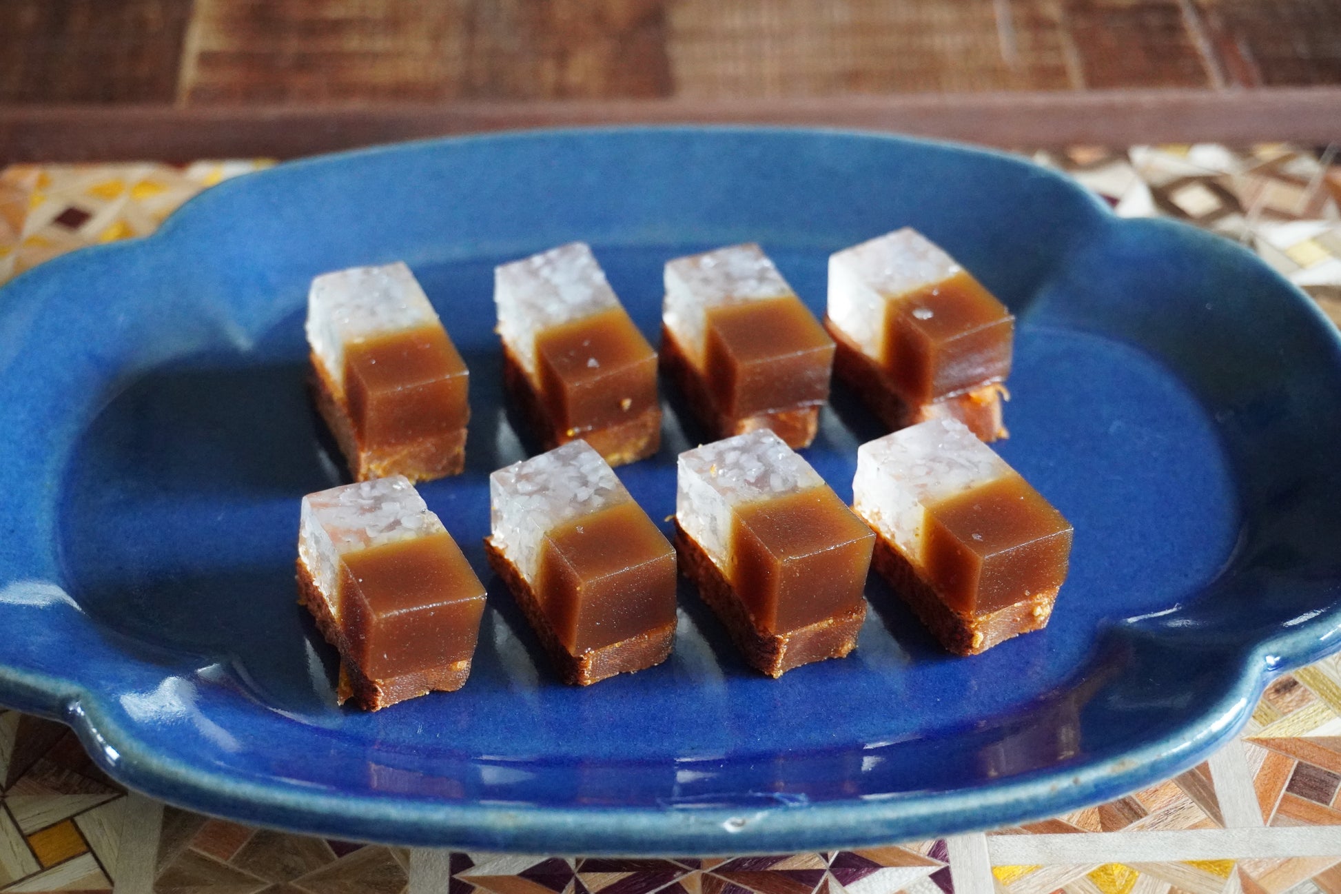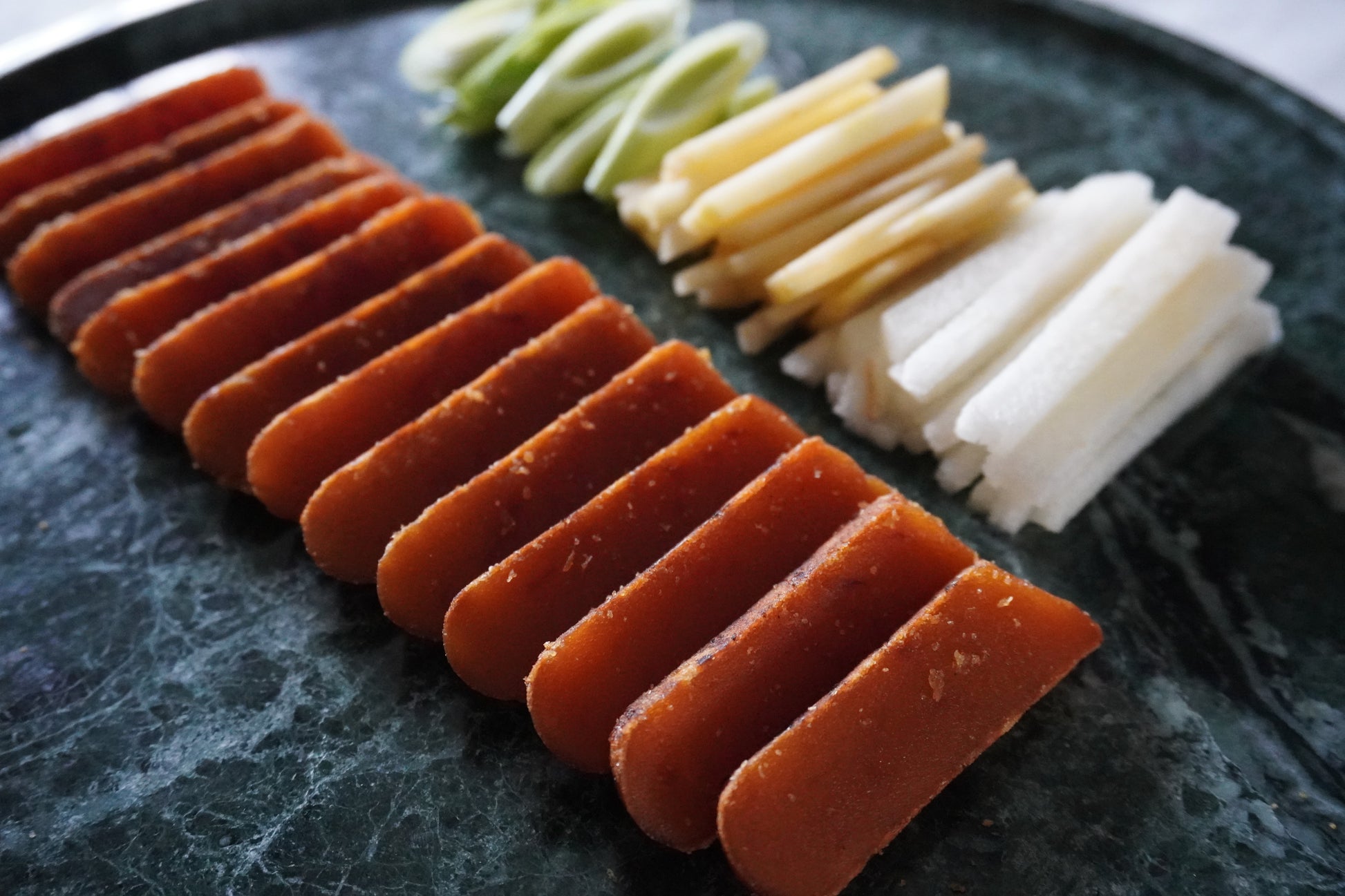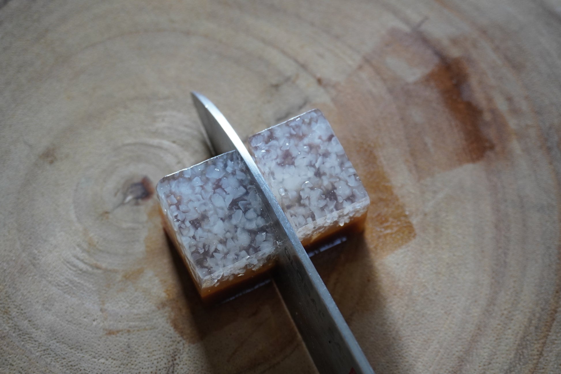 沒想到吧?【烏魚子+羊羹】超好吃!這是我之前拍影片發現的,當時用的是市售羊羹,我心想,何不請台灣超人氣和菓子品牌「Argyi 掬菓」量身定製?