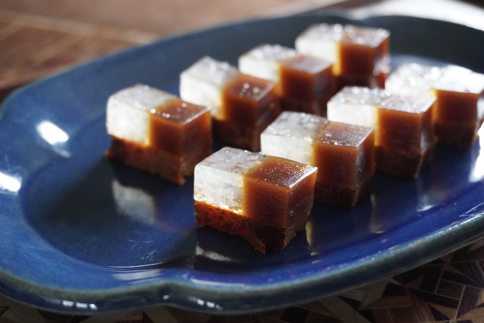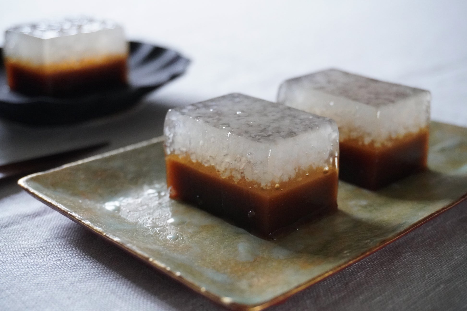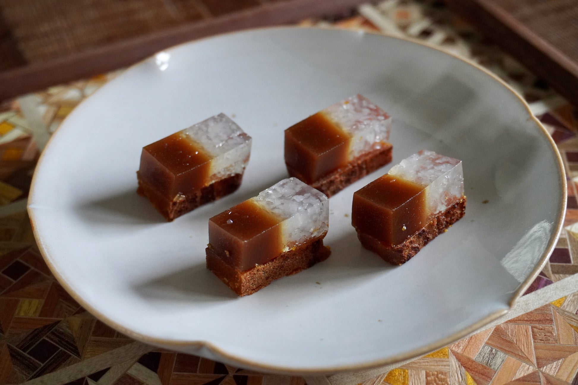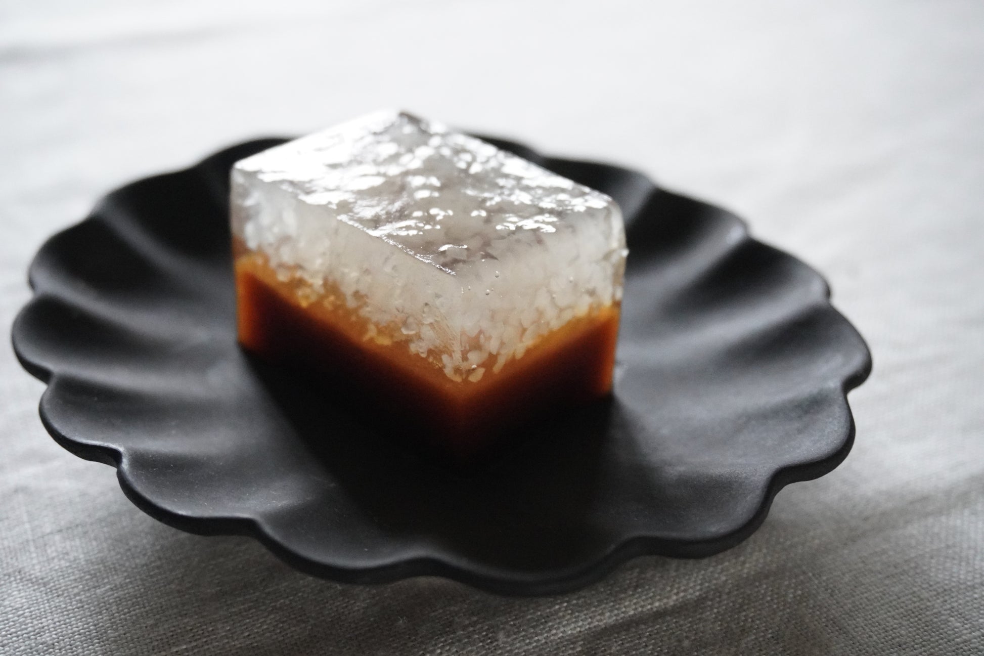 Argyi 接受挑戰,做出了完美配對烏魚子的羊羹!以「梅子」「威士忌」作為風味主調,Argyi 一方面用「蝶矢梅酒」的清新梅香帶出梅子酸甜,二方面調入威士忌加深風味厚實度;上層透明的「道明寺羹」則是寒天細碎糯米,展現冬日雪景,甜味改以柴燒黑糖,平衡梅酒與威士忌的酒感。