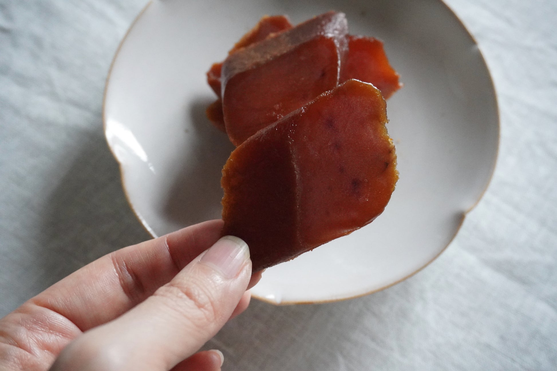 提到烏魚子,首先想到的就是水果了吧?搭配水梨、蘋果的烏魚子簡直是人間美味,用威士忌或高粱燒過的酒香也令人沈醉。但如果要作為和菓子的風味去搭配烏魚子的話,蘋果的味道還是淡了點。基於這樣的想法,我選擇了「梅子」「威士忌」作為這次的風味。